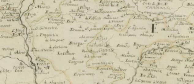 [...] de l'est de l'élection d'Evaux jusqu'à Ebreuil, dans l'élection de Gannat, c'est-à-dire les limites du Bourbonnais-Combrailles-Auvergne, sont très fortement affectées par la fraude qui se concentre essentiellement entre le Cher et la Sioule et s'établit curieusement en avant de la frontière des gabelles : les faux-sauniers résident surtout en Combrailles et en Auvergne, c'est à dire en pays rédimé.